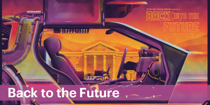 نمونه پوستر تبلیغاتی بعدی پوستر بازگشت به آینده است. در این پوستر سبک کلاسیک با یک ماشین زمان روبهرو میشوید که در آن از رنگهای گرم برای جذب بیشتر استفاده شده است. پوستر بر روی دستگاه زمان DeLorean تمرکز میکند، اما از طریق درهای جالبی به جزئیات نزدیک میشود.
